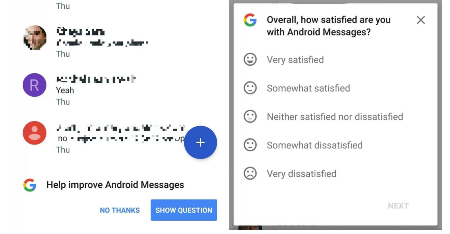 Viele Nutzer der SMS-App Android Messages sehen in den letzten Tagen direkt in der Oberfläche der App einen kleinen Hinweis darauf, dass sie an einer sehr kurzen Umfrage zur Zufriedenheit teilnehmen können. Stimmt man dem zu, kommen dann eine paar kurze Fragen zur App, wobei es leider nur von der ersten Frage einen Screenshot gibt – nämlich zur allgemeinen Zufriedenheit. Hat man die Fragen beantwortet, gibt es noch einen kleinen Dank, und das Thema ist erledigt.