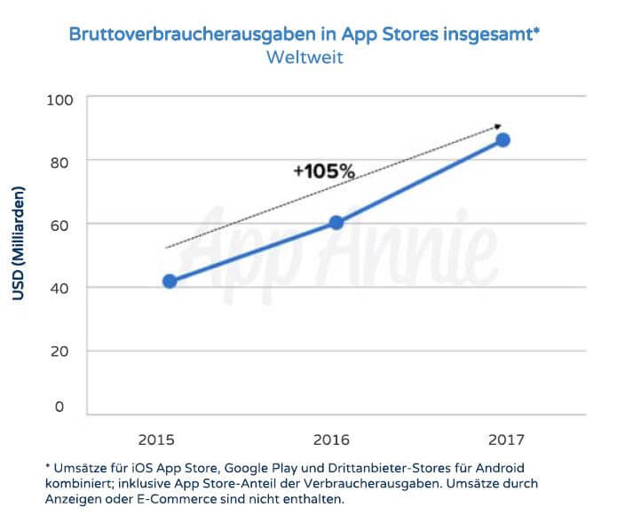 Glaubt man den Zahlen von App Annie, dann ist allein der durch Apps und Spiele erzielte Umsatz im Laufe der letzten zwei Jahre um mehr als 100 Prozent gestiegen, wobei die Kurve sogar für das vergangene Jahr noch weiter nach oben zeigt. Den größten Zuwachs konnte Apple verbuchen, aber auch Google nagt nicht am Hungertuch und erwirtschaftet Jahr für Jahr Milliardenumsätze mit Google Play, wovon aber natürlich der größte Teil auch wieder an die Entwickler ausgeschüttet wird.