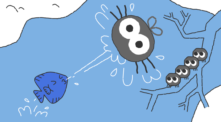 Das heutige Doodle beginnt direkt in einem See, in dem wohl gestern noch die Valentinstags-Schwäne geschwommen sind: Auf einem Ast sitzen fünf Insekten, die dem Treiben eigentlich nur gemütlich zusehen. Doch dann kommt der Schützenfisch aus dem Wasser und zeigt seine besondere Begabung: Durch gezieltes Wasserspritzen aus dem Mund (er kneift dabei sogar Stilecht ein Auge zu) schießt er auf die Insekten und lässt sie so eines nach dem anderen in das Wasser plumpsen.
