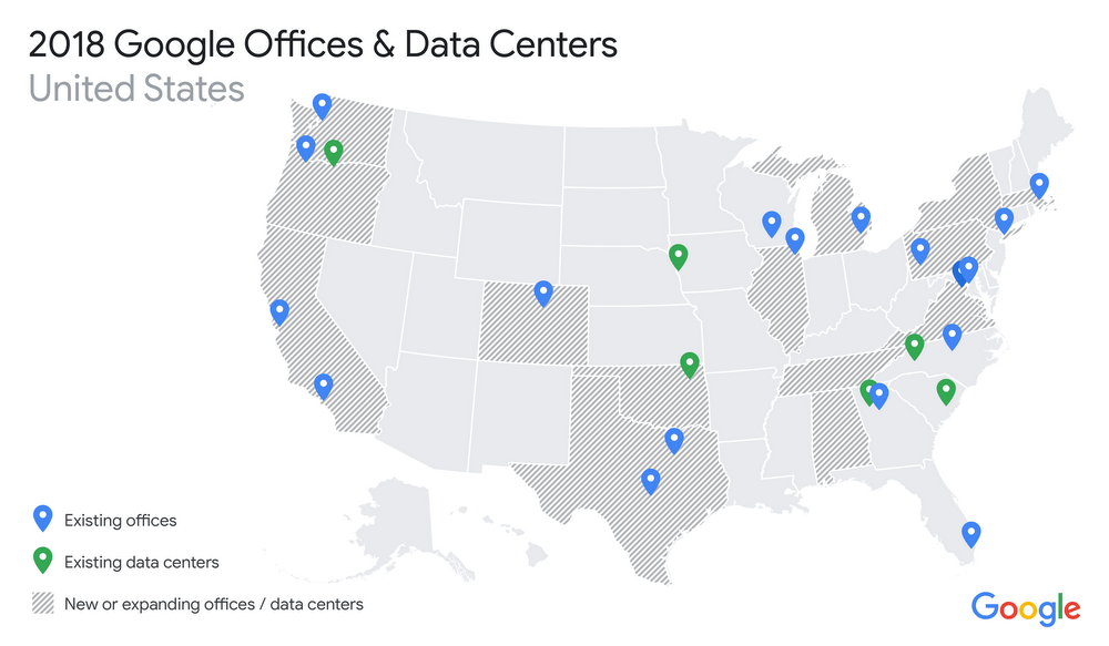 Zusätzlich zum Aus- und Aufbau der fünf Rechenzentren wird Google außerdem die Niederlassungen in neun Bundesstaaten erweitern, um noch mehr Menschen beschäftigen zu können. In diesem Jahr sollen Tausende neue Mitarbeiter eingestellt werden, wobei aber auch hier natürlich nicht verraten wird, in welchen Bereichen diese arbeiten werden. Mittlerweile arbeiten 80.000 Menschen bei Google/Alphabet – 8.000 mehr als im Vorjahr. Gut möglich, dass die Mitarbeiter-Anzahl in diesem Jahr noch stärker wächst.