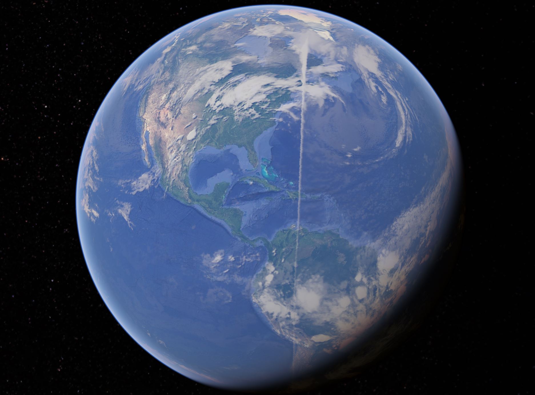 Seit einigen Tagen gibt es etwas sehr merkwürdiges auf dem Erdball zu sehen, das für Rätselraten sorgt: Von der nordöstlichen Spitze Nordamerikas bis zur südlichen Spitze von Südamerika zieht sich eine riesige dünne Wolkenformation. Diese reicht von Kanada bis Chile/Argentinien und hat eine Länge von etwa 12.600 Kilometern. Da die Wolke schnurgerade verläuft und sehr dünn ist, kann man zu 99,99 Prozent davon ausgehen dass es sich dabei um einen Renderfehler handelt.