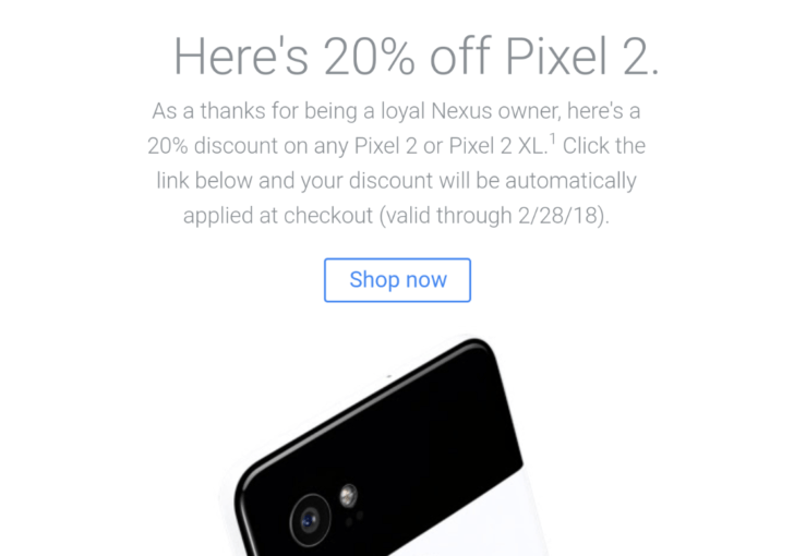 Das Pixel 2 ist mit seinem Preis schon ein recht teures Gerät. Google verschickt derzeit vermutlich nur in den USA E-Mails mit Rabatt für loyale Nexus-Besitzer. 20% kann man dadurch sparen.