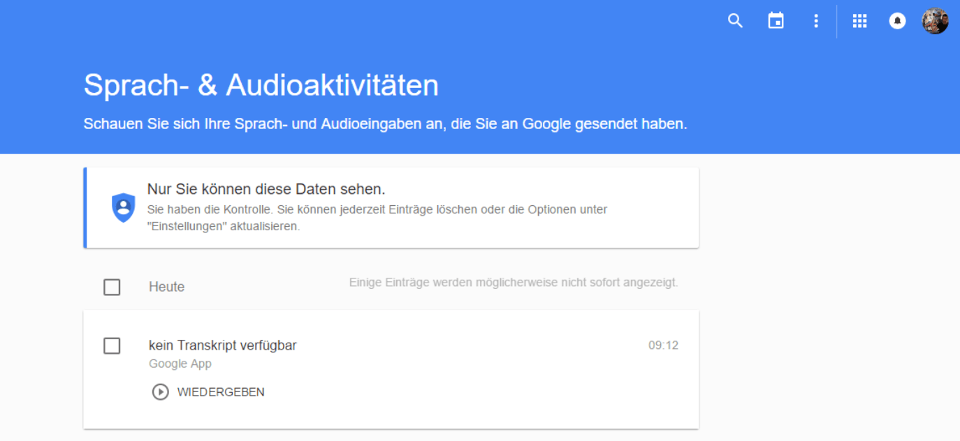 Wenn die Assistenten auslösen, gibt es normalerweise ein akustisches als auch ein optisches Signal, so dass der Nutzer genau sehen kann, wann aufgezeichnet wird und wann nicht. Wer sich aber nicht ganz sicher ist, was nun tatsächlich aufgenommen wurde, kann sich ALLE Aufnahmen des Google Assistant auch noch einmal ansehen und natürlich auch anhören. Dafür gibt es seit langer Zeit ein eigenes History-Portal.