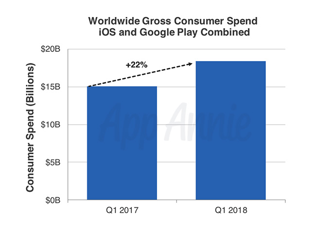Im Vergleich zum Vorjahr wurden im 1. Quartal 2018, das das bisher stärkste Quartal überhaupt gewesen ist, 22 Prozent mehr Apps herunterladen. Dafür dass der Markt eigentlich ziemlich gesättigt ist, ist das ein gewaltiger und überraschend großer Sprung. Dazu zählen übrigens nur die Erst-Downloads und nicht die Updates oder die erneuten Downloads nach einem Wechsel des Geräts.