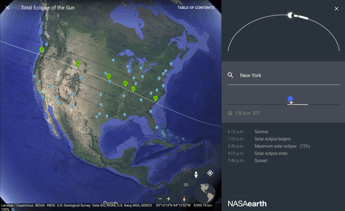 Anlässlich der großen Sonnenfinsternis im vergangenen Herbst hat Google sogar ein Tool gebaut, mit dem die Sonnenfinsternis Live in Google Earth verfolgt und auch immer wieder abgespielt werden konnte. In folgender Animation ist das ganze noch einmal zu sehen.