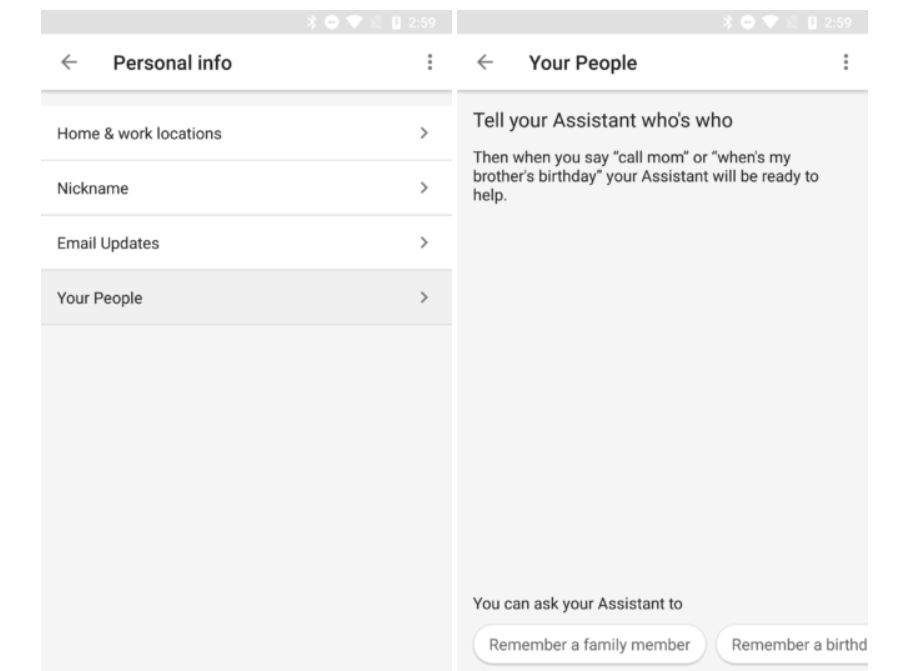 Der Google Assistant bietet schon seit langer Zeit die Möglichkeit, bestimmte Personen mit einer anderen Bezeichnung als ihrem Namen zu betiteln. Nach einmaliger Konfiguration kann man so „Mama“ und „Bruder“ oder auch „Schwester“ direkt ansprechen, so wie man es vielleicht auch im Alltag tun würde. In den Einstellungen gibt es nun ein neues Menü, in dem genau solche Einstellungen wohl vorgenommen oder kontrolliert werden können. Bisher ist das Menü aber leer und bietet nur entsprechende Beispielsätze für den Assistant, die aber ebenfalls noch nicht zum gewünschten Ergebnis führen.