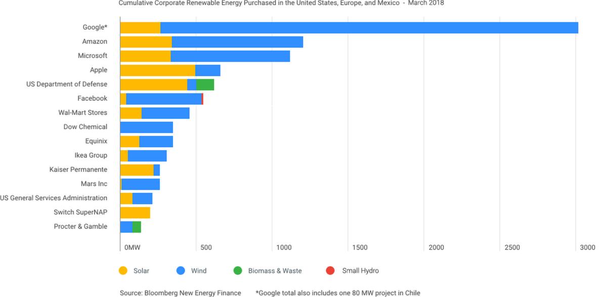 Das ganze findet also nur auf dem Papier und auch nur unter dem Strich statt, ist aber dennoch nicht weniger lobenswert. Gleichzeitig treibt Google mit solchen Aktionen auch andere Unternehmen an, ihren CO2-Fußabdruck zu verkleinern. In folgender Grafik zeigt sich, dass Google weit an der Spitze steht und alle anderen großen Unternehmen noch Nachholbedarf haben.