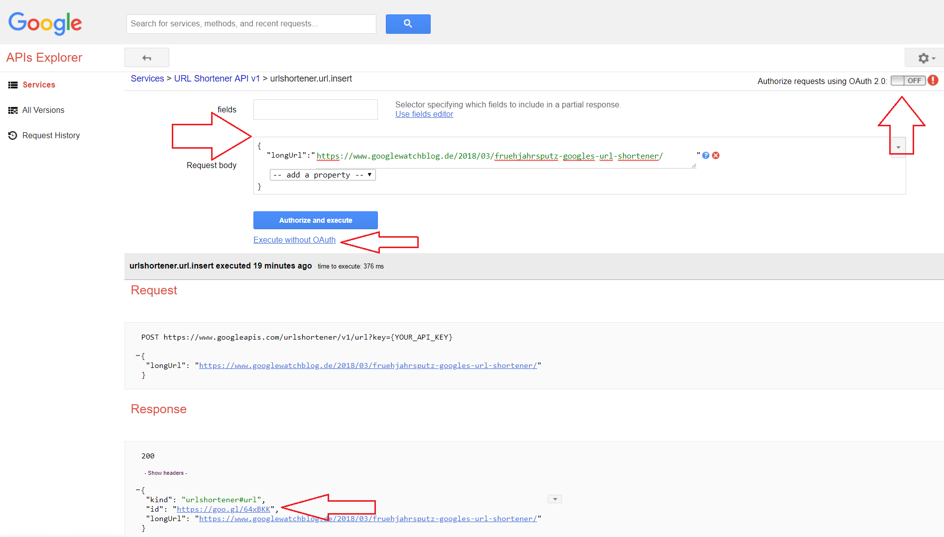 - Jetzt unter dem blauen Aktions-Button auf „Execute without OAuth“ klicken