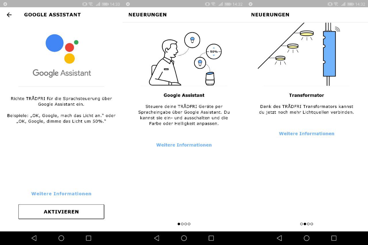 Um die neue Möglichkeit zu nutzen, benötigt ihr die TRADFRI-App und müsst diese mit eurem Google-Konto verbinden. über diese App werden die einzelnen Leuchten verwaltet und können auch direkt angesprochen werden. Steht die Verbindung, kann die App auch per Google Assistant ferngesteuert werden und ermöglicht so eine bequeme Steuerung der Lampen per Sprache. Dazu muss nur noch einmalig eine Einrichtung vorgenommen werden, so wie es auf folgenden drei Screenshots sehr gut ersichtlich ist.