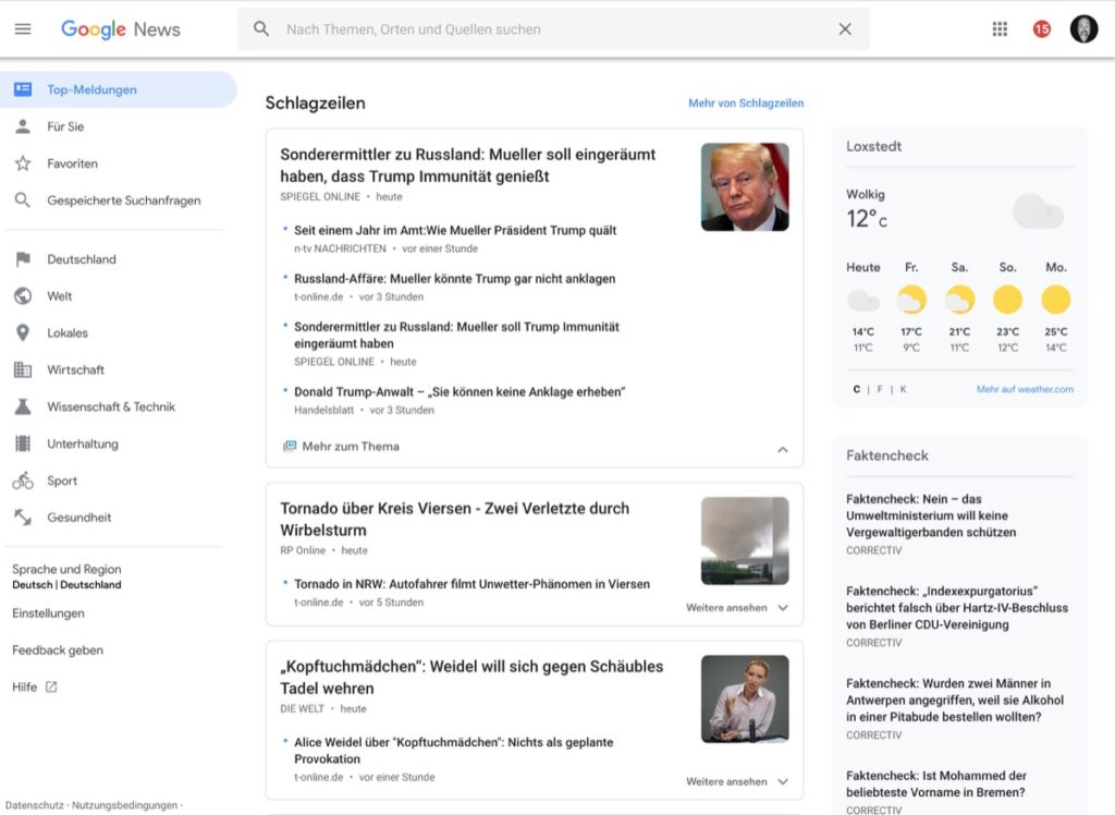 Der Suchalgorithmus von Goggle News ist ja personenbezogen da er u.a. auf der Annahme beruht was einen pers interessieren könnte. Eine einzige Katastrophe. Jan Reichelt Bildzeitungsniveau.