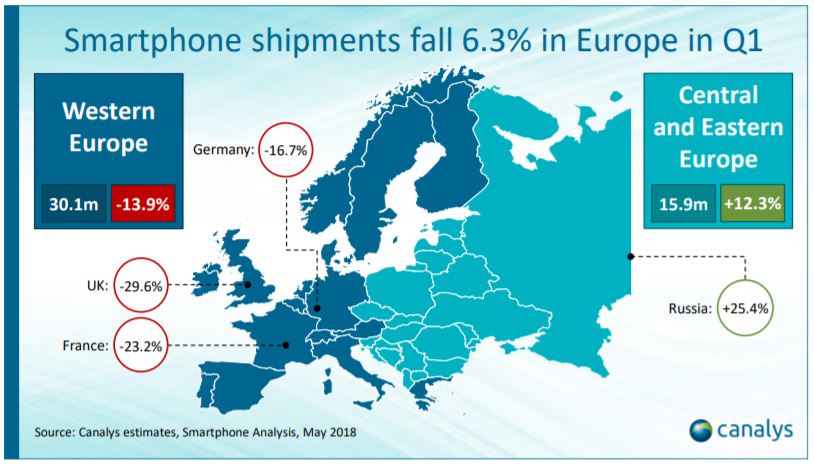 Seit zwei Quartalen in Folge sind die Verkaufszahlen der Smartphones gesunken, was aber beim derzeitigen Innovationsstau und vor allem nach dem 10-jährigen ungebremsten Wachstum nicht wirklich überraschend ist. Insgesamt wurden weltweit etwa 2,9 Prozent weniger Smartphone verkauft als im Vorjahresquartal, womit der Rückgang noch einigermaßen zu verkraften ist. In Europa hingegen ist der Einbruch sogar doppelt so hoch – und in Westeuropa fast schon dramatisch.