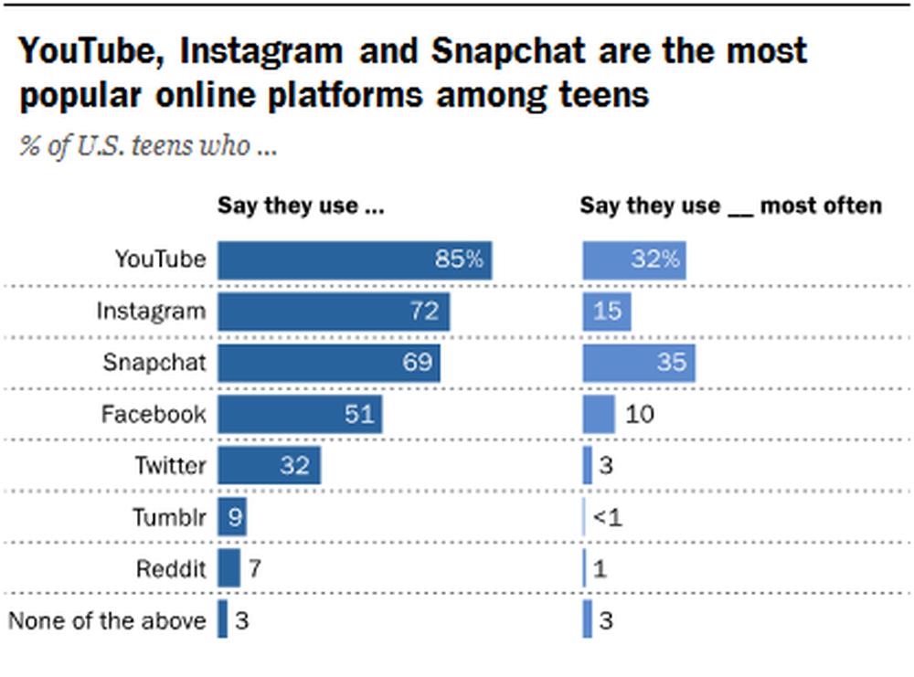 Bei der Frage, welche Plattformen sie am häufigsten nutzen, führt Snapchat mit 35 Prozent die Umfrageergebnisse an. Knapp dahinter folgt aber auch schon YouTube, dass von 32 Prozent aller US-Teenager am häufigsten verwendet wird. Hier kommt Facebook nur noch auf 10 Prozent, was dem Social Network wohl zu denken geben sollte. Fraglich ist, wie diese Werte mit den offiziell verkündeten Nutzerzahlen von Facebook, Snapchat und Twitter zusammenpassen.