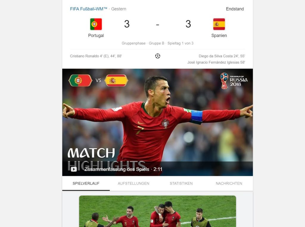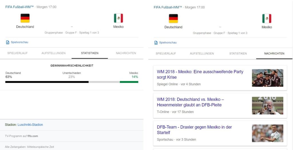 Seit drei Tagen ist die halbe Welt wieder im Fußballfieber und hat bereits enige gute Spiele in der Fußball-Weltmeisterschaft 2018 in Russland gesehen. Das „Finalspiel am zweiten Tag“ zwischen Portugal und Spanien ist bisher das unbestrittene Highlight. Für die deutsche Nationalmannschaft wird es erst heute Nachmittag erstmals ernst und die Euphorie kann dann auch hochoffiziell hierzulande starten. Damit ihr vom heutigen Spiel nichts verpasst, gibt es hier noch einmal einen Blick auf die vielen Informationen, die Google zu jedem einzelnen Match liefert und natürlich auch für Deutschland-Mexiko zur Verfügung stellt.