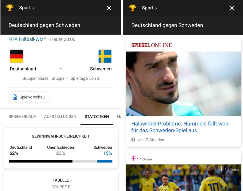 Seit über einer Woche ist die Sportwelt wieder im Fußballfieber und hat schon sehr viele gute und teils auch überraschende Spiele in der Fußball-Weltmeisterschaft 2018 in Russland gesehen. Nachdem sich die deutsche Nationalmannschaft gegen Mexiko nicht gerade mit Ruhm bekleckert hat, stehen für „Die Mannschaft“ jetzt nur noch Endspiele an, die allesamt gewonnen werden müssen. Damit ihr vom heutigen Spiel gegen Schweden nichts verpasst, gibt es hier noch einmal einen Blick auf die vielen Informationen, die Google zu jedem einzelnen Match liefert und natürlich auch für Deutschland-Schweden zur Verfügung stellt.