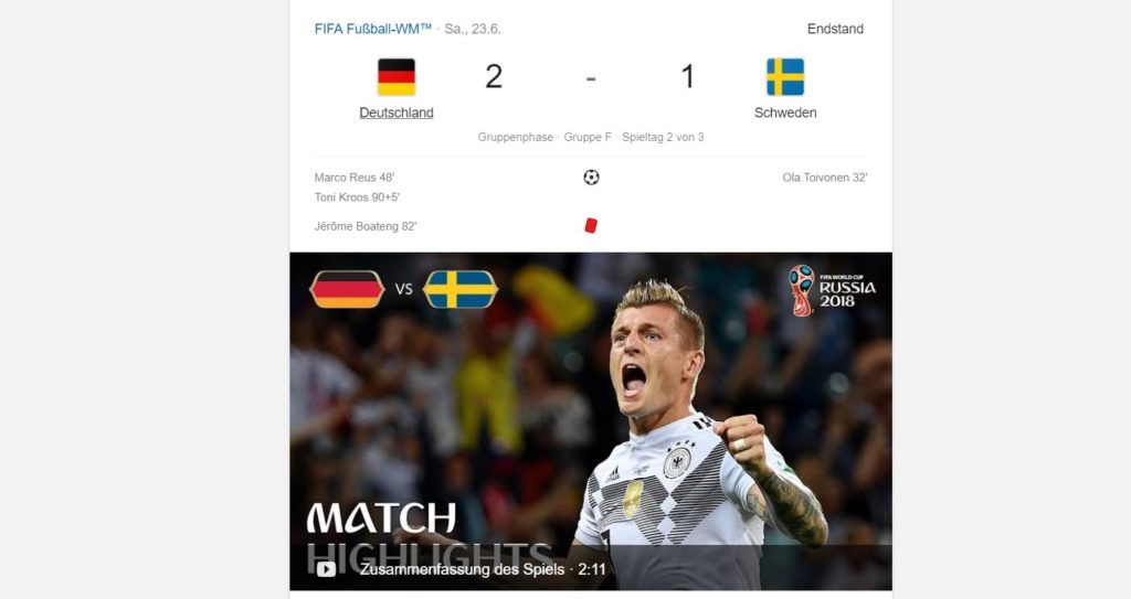 Nachdem die deutsche Mannschaft gegen Mexiko für eine Schockstarre bei Millionen Fans gesorgt hat, hat der Krimi gegen Schweden alle erlöst und die kroosartigen Hoffnungen auf ein Weiterkommen am Leben erhalten. Zwar präsentiert sich „Die Mannschaft“ nach wie vor nicht in Bestform, aber gegen Südkorea – als vermeintlich schwächste Mannschaft in der Grupe F – sollte es reichen. Im folgenden listen wir noch einmal auf, wie Google über alle WM-Spiele informiert und euch auch über das Match Deutschland – Südkorea VOR, WÄHREND und NACH dem Spielauf dem Laufenden hält. Für alle Informationen ist die einfache Suchanfrage WM 2018 euer Freund.