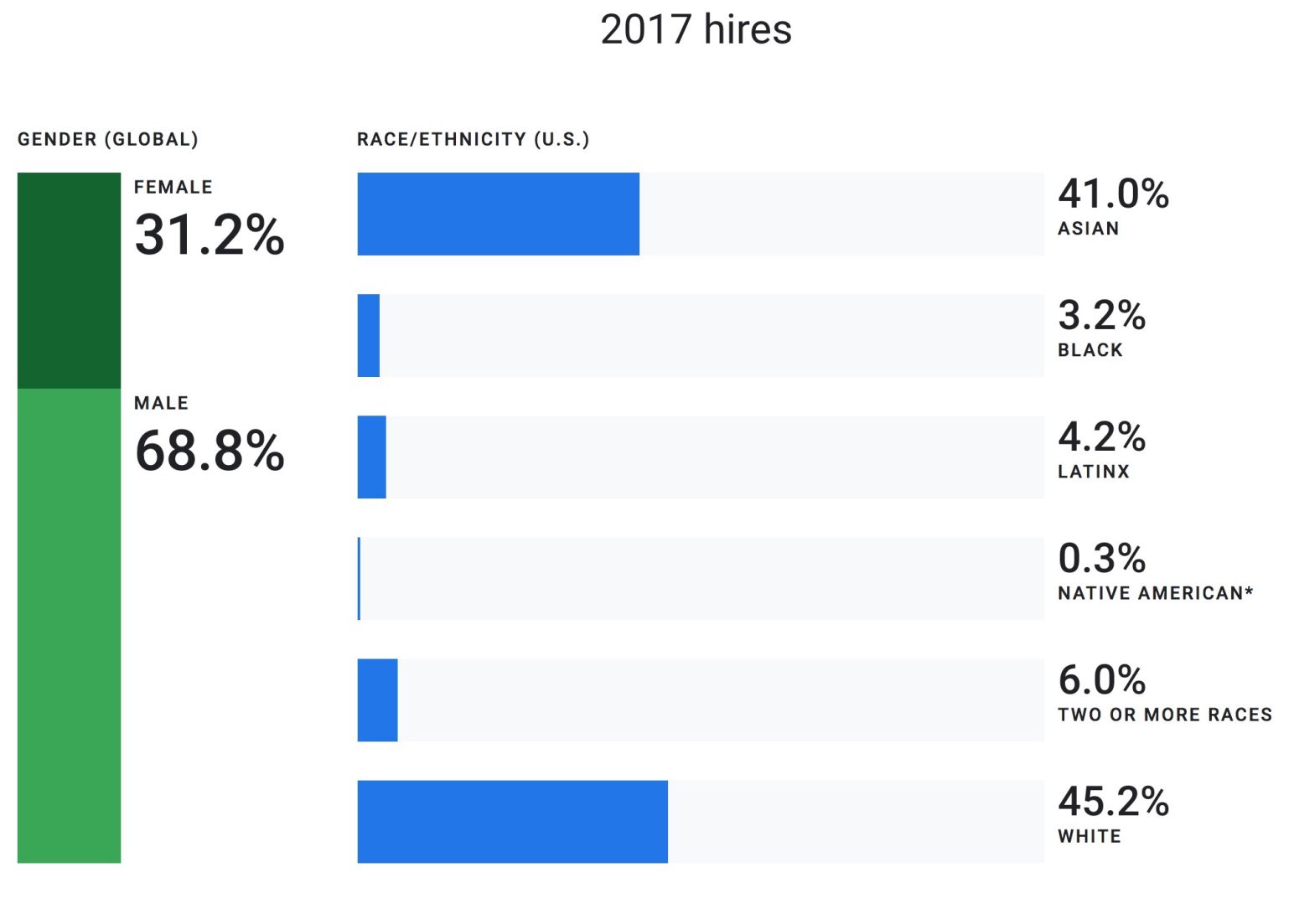 Die letzte Grafik zeigt, welche Geschlechter und Herkünfte im Jahr 2017 eingestellt wurden. Die Frauen haben gegenüber den Männern im gesamten stark aufgeholt, doch bei der Herkunft der Menschen dominieren noch immer die Weißen und die Asiaten.