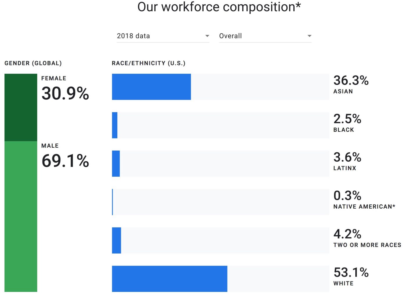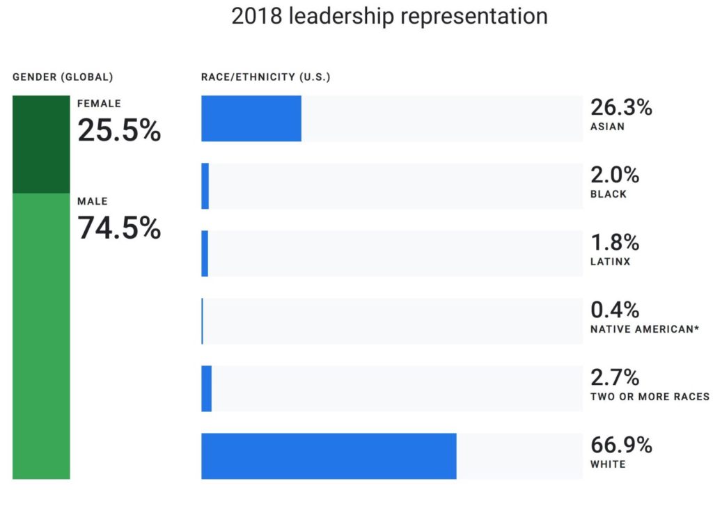 Interessant ist nun noch die Kombination aus Geschlecht und ethnischer Herkunft im gesamten Unternehmen. Wie man sieht, stellen die weißen Männer die größte Gruppe, gefolgt von den asiatischen Männern und dann den weißen Frauen und asiatischen Frauen. Googles CEO Sundar Pichai gehört übrigens zur zweiten Gruppe, denn er ist bekanntlich Inder.