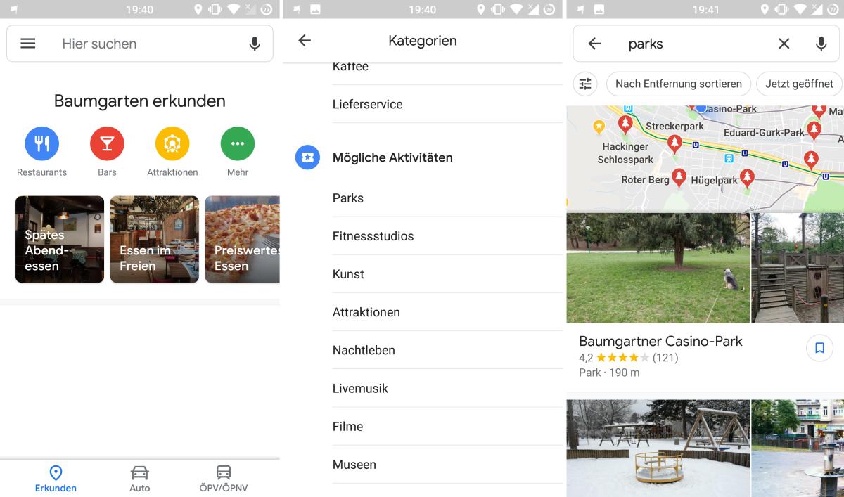 Auf den ersten Blick fällt bereits auf, dass sich an der Oberfläche einiges getan hat: Alle Elemente sind nun abgerundet und wirken damit nicht nur moderner, sondern entsprechen auch Googles neuen Design-Grundlagen. Am unteren Rand befinden sich nach wie vor drei Buttons, hinter denen sich viele weitere Informationen verstecken, die sich auf den jeweiligen aktuellen Kartenausschnitt beziehen: Erkunden, Auto und ÖPNV. Der vierte Tab, For You fehlt in der deutschen Oberfläche.