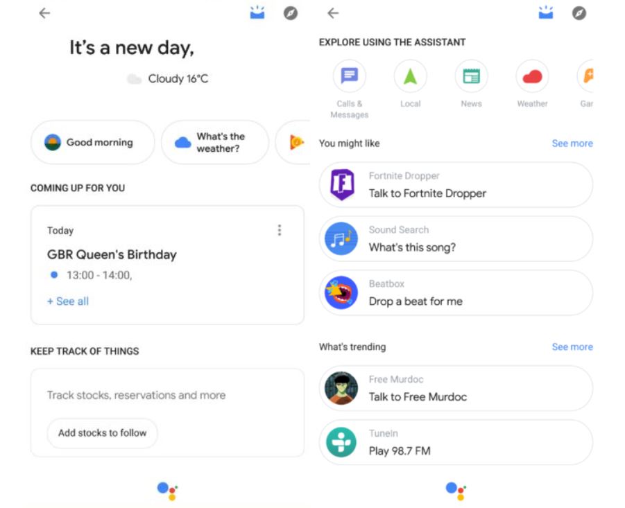 Zuerst wird man begrüßt und mit Informationen über das Wetter versorgt, dann folgen schon erste Verlinkungen zu populären Assistant-Anfragen nach mehr Wetter-Informationen oder dem Starten von Musik. Darunter sehen wir dann die anstehenden Termine und können Aktien und andere Dinge hinzufügen, die verfolgt werden sollen. Dazu dürften dann vermutlich auch Themen gehören, die wiederum perfekt aus dem Feed abgezeogen werden können.