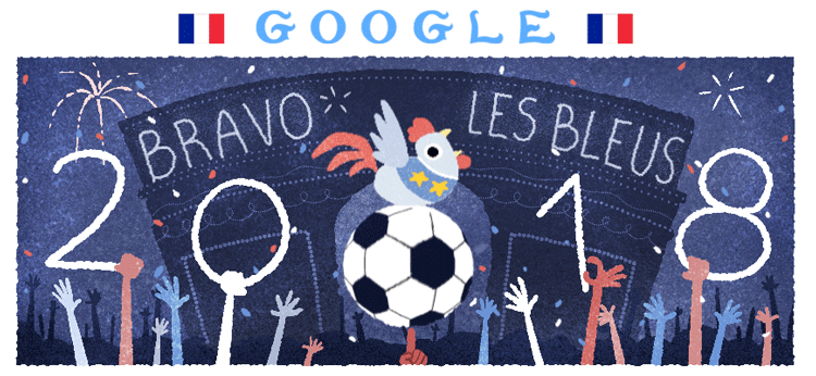 Das obige Doodle wird zum zweiten Titelgewinn der Franzosen geschaltet und muss eigentlich nicht näher erklärt werden: Wir sehen eine kleine Gratulation im Hintergrund und das Logo der Mannschaft hat nach 20 Jahren nun endlich den zweite Stern erhalten. Dazu gibt es natürlich ein Feuerwerk. Das Doodle wird heute nur in Frankreich angezeigt.