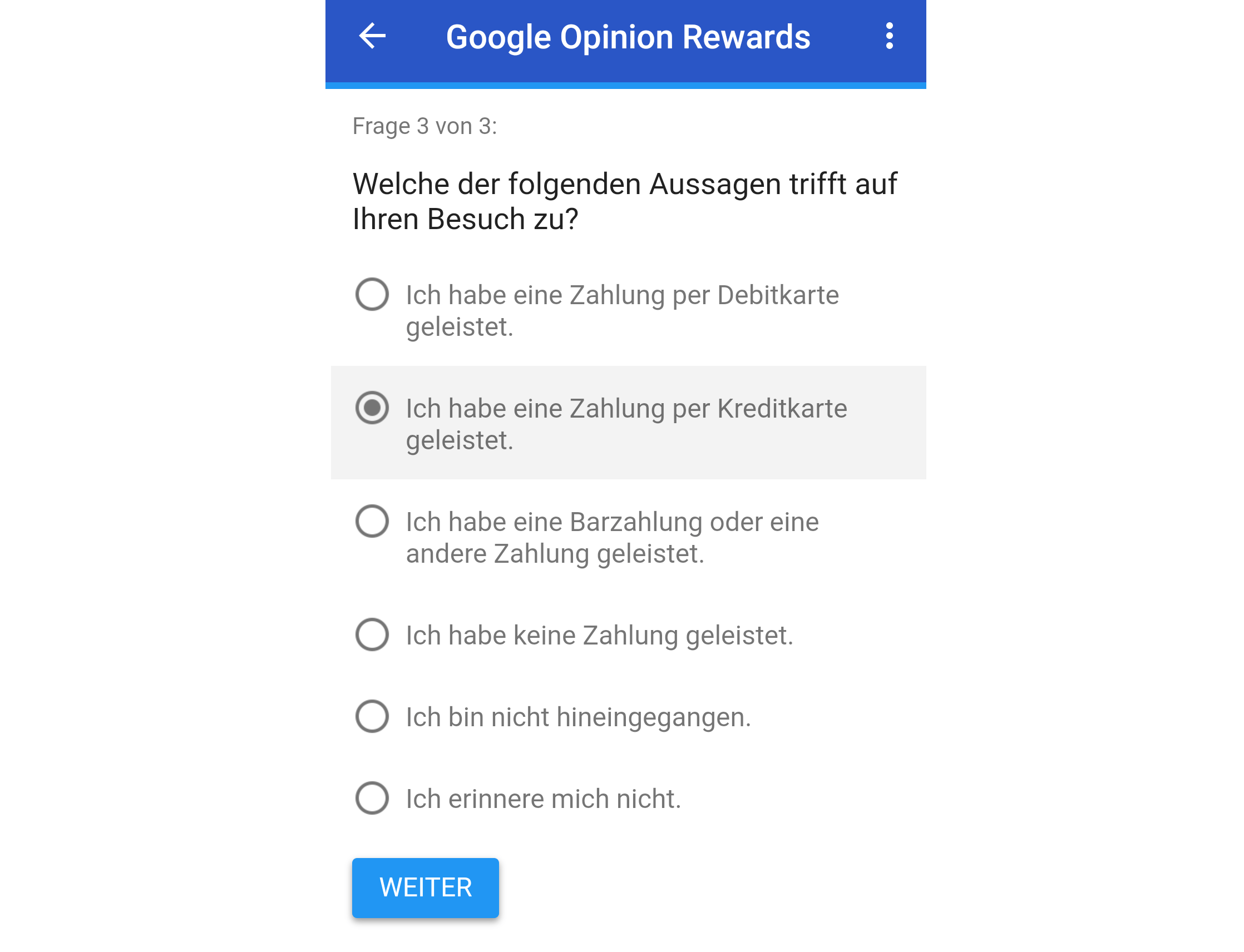 Den Start von Google Pay kann man wohl als zäh erfolgreich zusammenfassen. Probleme jeglicher Art hat es nicht gegeben, viele Händler unterstützen diese Zahlungsmethode aber dafür sind anfänglich nur wenige Partnerbanken dabei. Jetzt versucht Google sich erst einmal einen Überblick darüber zu verschaffen, womit die Nutzer überhaupt bezahlen – und nutzt dafür unter anderem auch die hauseigene Umfrage-App. Dort kommt nun bei fast jeder Umfrage im dritten Schritt die Frage nach der Zahlungsmethode.