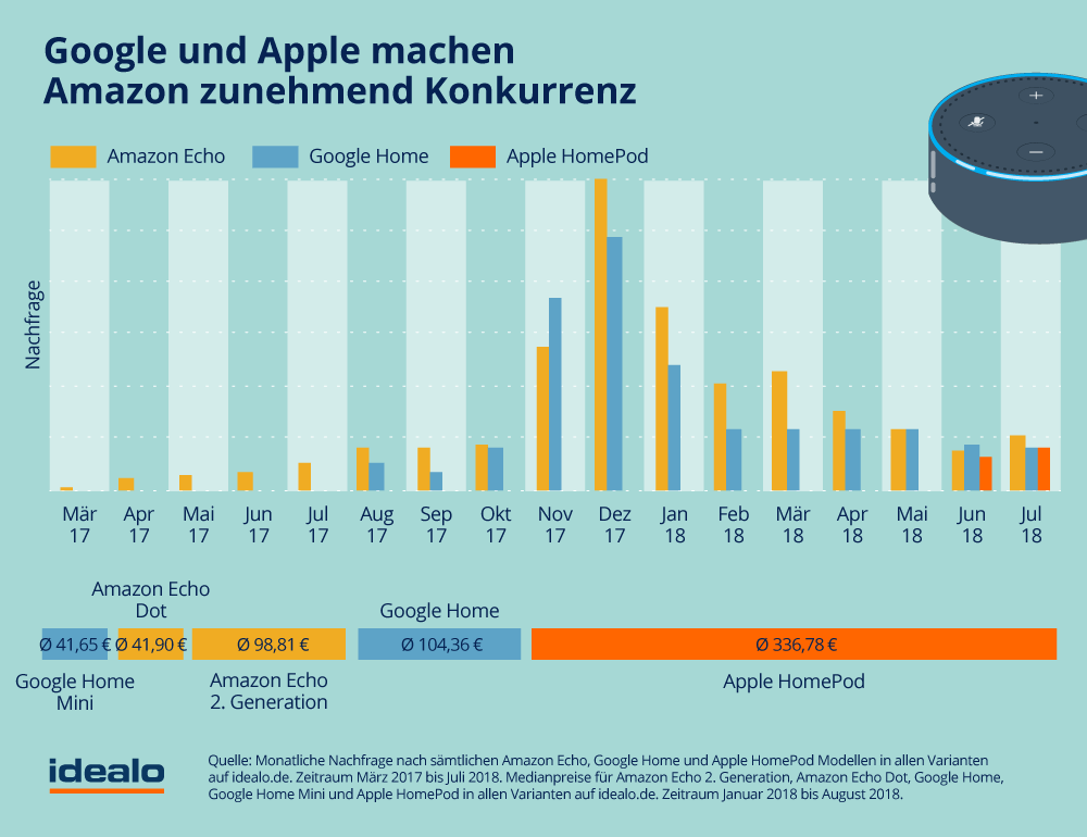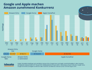 Der Preisvergleich Idealo hat ins einem Magazin in diesen Tagen die Nachfrage nach den unterschiedlichen Smart Speakern analysiert und stellt in einer Grafik die Entwicklung der Nachfrage dar. Demnach holt sowohl Google, als auch inzwischen Apple Amazons Echo* ein und machen so Konkurrenz. Man darf gespannt sein, wie sich die Sache in den nächsten Monaten entwicklet.