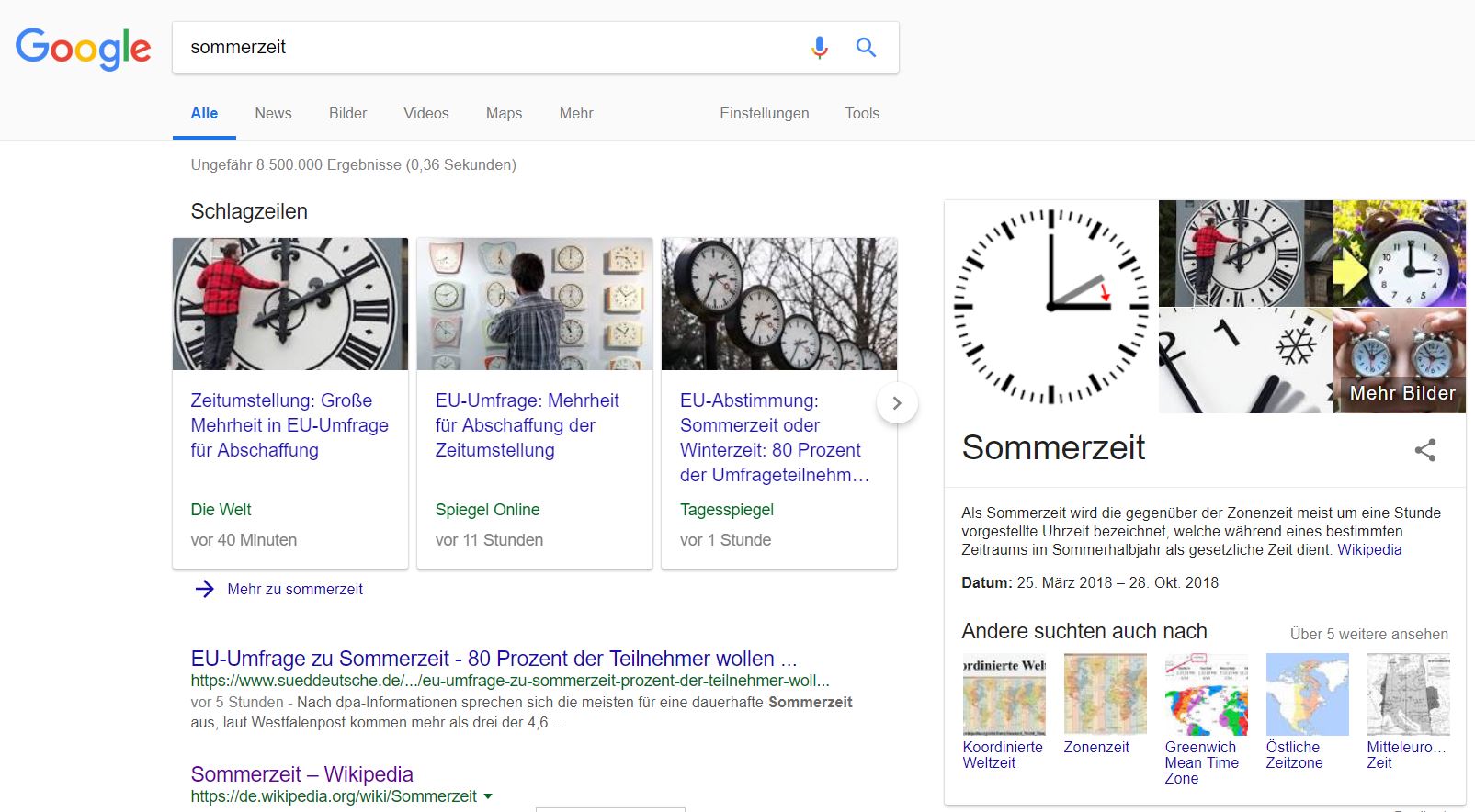 In den vergangenen Wochen konnten EU-Bürger bei einer Online-Umfrage darüber abstimmen, ob die Zeitumstellung abgeschafft oder beibehalten werden soll. Jetzt ist das Ergebnis durchgesickert und zeigt wenig überraschend, dass die Mehrheit der Menschen gegen die halbjährliche Umstellung ist. Zeit für einen kurzen Vergleich der Google-Ergebnisseiten zu diesem Thema, die tatsächlich sehr unterschiedlich sind.