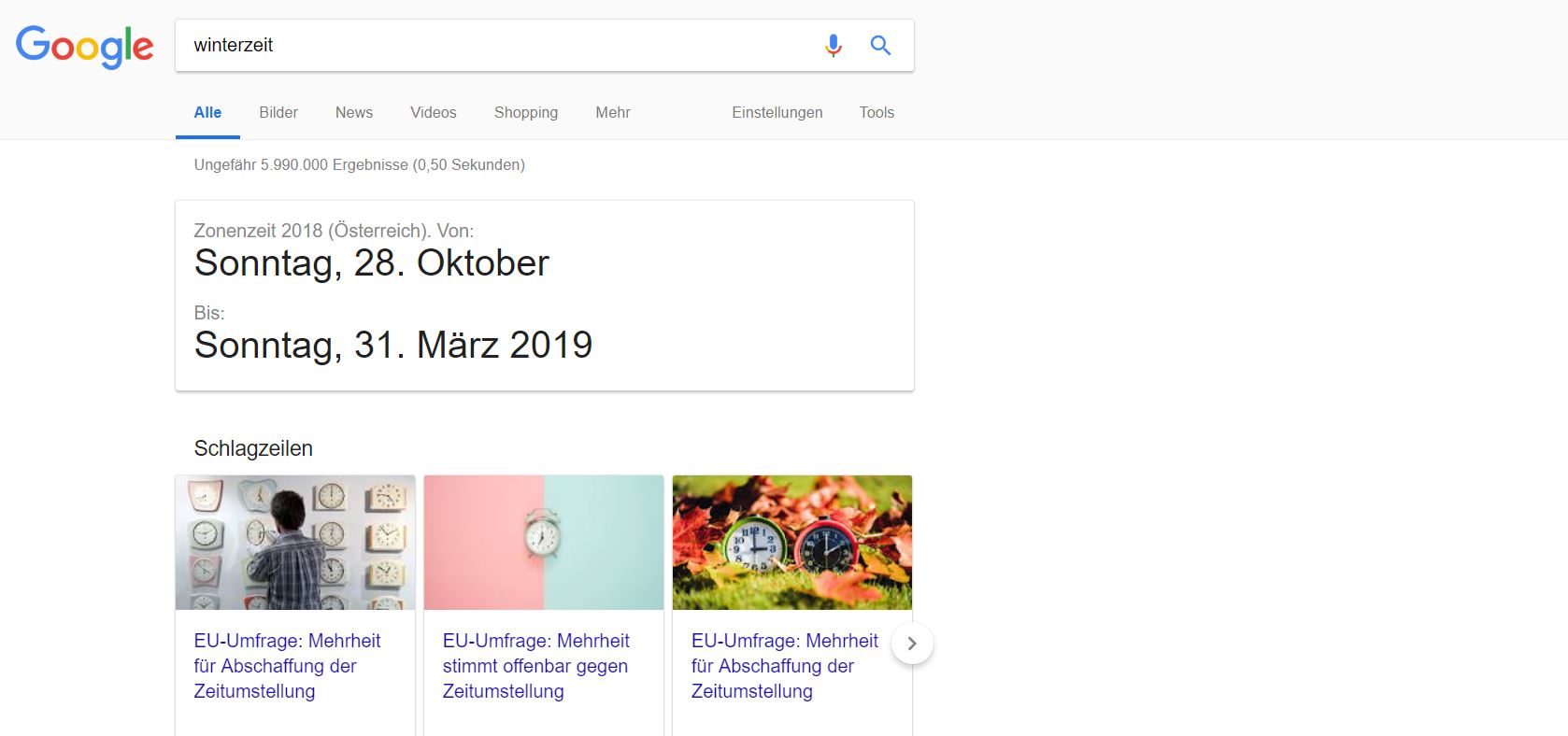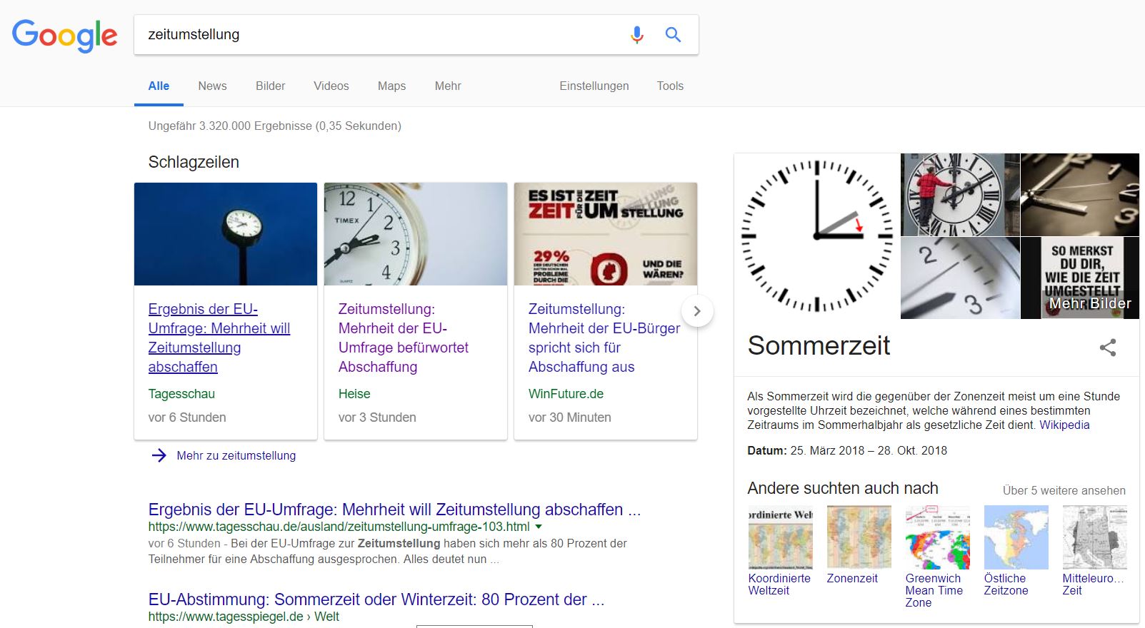 Nun noch das naheliegendste Stichwort: Das Wörtchen „Zeitumstellung“ wird zumindest im Knowledge Graph mit „Sommerzeit“ gleich gestellt und zeigt die Informationen aus den oben beschriebenen Ergebnissen an. Damit haben wir aber noch keine Information, in welche Richtung wir die Uhr im Oktober stellen müssen. Natürlich in die andere Richtung als bei der Sommerzeit angegeben, aber bei diesem für viele verwirrendem Thema könnte es schon etwas mehr sein. Eine Onebox gibt es nicht.