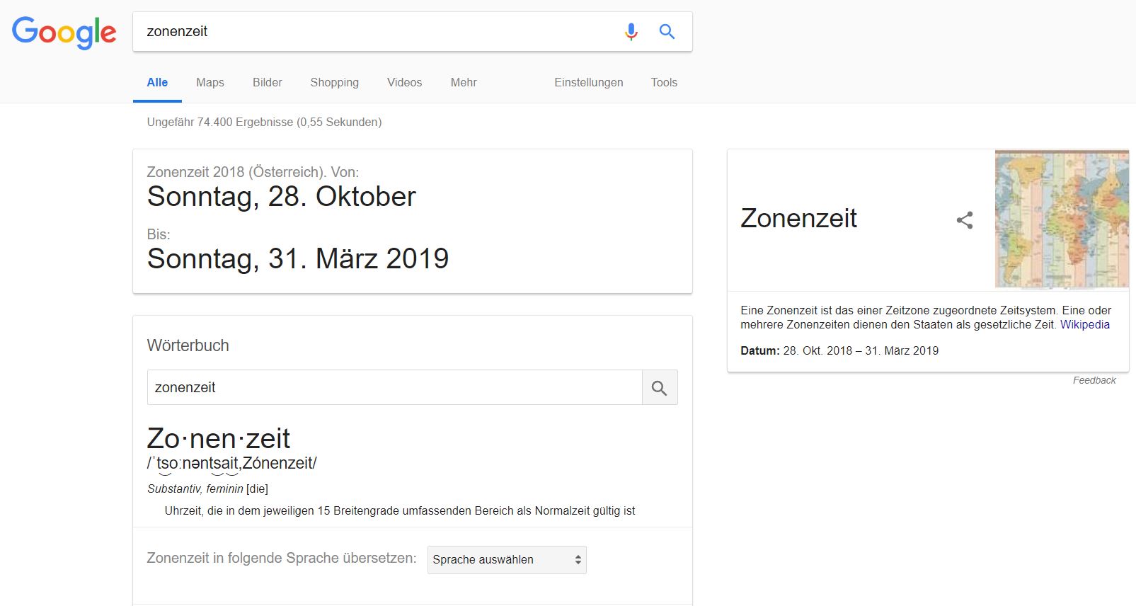 Die Suche nach „Zonenzeit“ bringt uns die gleiche Onebox, liefert aber lustigerweise noch ein weiteres zusätzliches Feature, das an dieser Stelle nicht wirklich gefragt war und auch keine Relevanz zum Thema hat: Der Eintrag aus dem Wörterbuch, der sich noch erweitern lässt und einige Informationen über diese Vokabel bereithält und sie übersetzen kann. Hier gibt es nun auch wieder einen Knowledge Graph, der aber lediglich einen sehr kurzen Wikipedia-Auszug zeigt, ohne ein passendes Uhren-Bild. Das Datum der Umstellung wird erneut gezeigt.