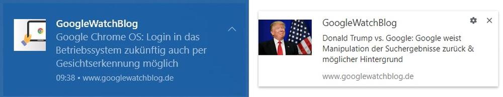 Wie man sieht, entsprechen die Chrome-Benachrichtigungen dem Design des Browsers und sind somit schon rein optisch eher zu bevorzugen. Unter Windows hingegen kommen die „hässlichen blauen Klötze“ zum Einsatz, bei denen weder der Text gut lesbar ist, noch das Vorschaubild irgendwie in das Design passen will. Aber auch funktional muss man Abstriche machen: Kommen mehrere Benachrichtigungen gleichzeitig rein, werden sie nicht gestapelt, sondern nacheinander abgearbeitet. Auch über den Sound kann man streiten.