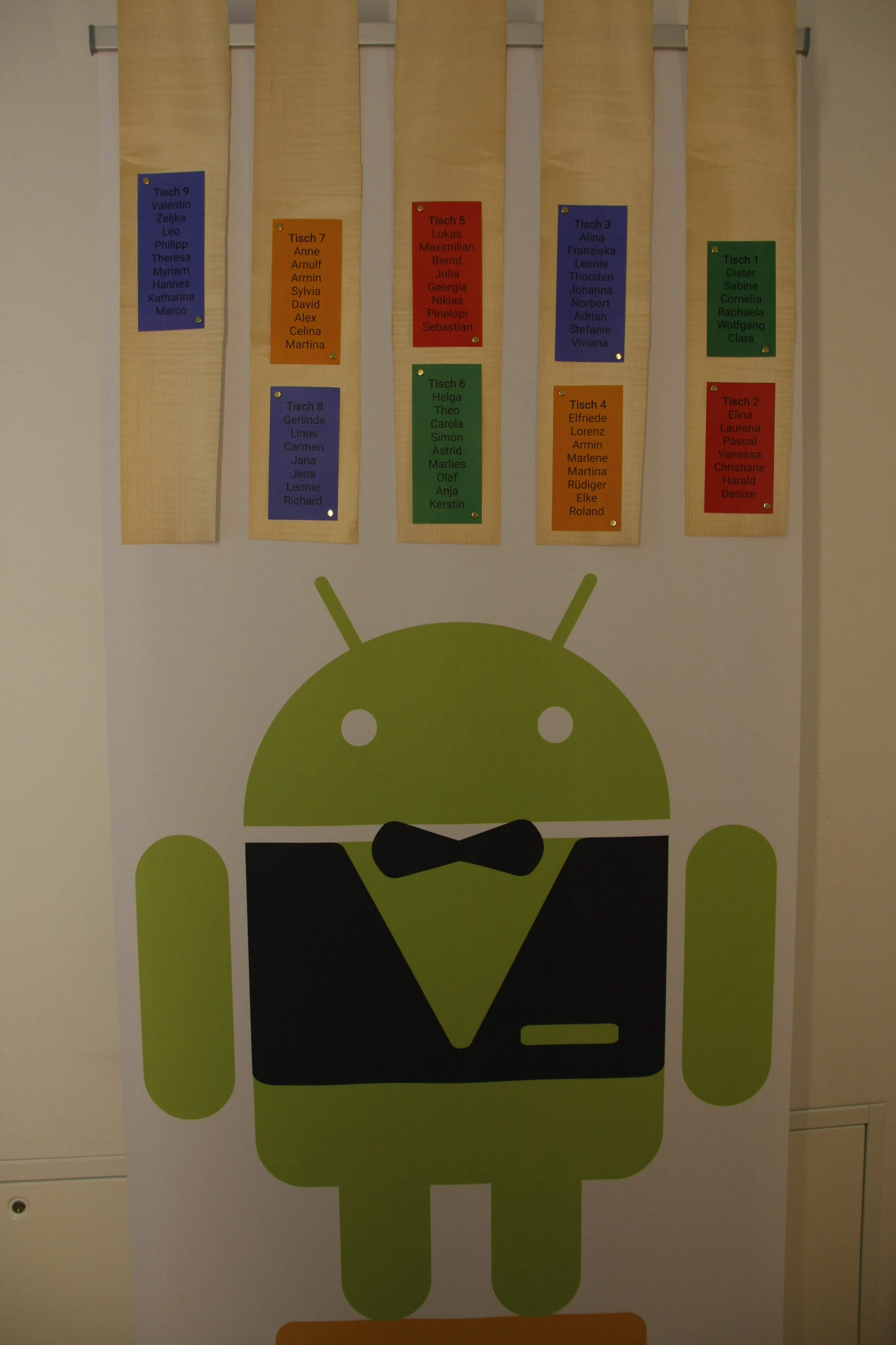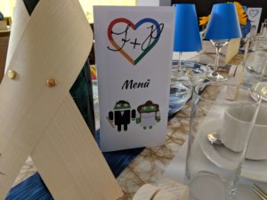 Wie schon erwähnt wurden die Google-Farben für die Deko genutzt. Ein stillvoller Android als Butler wies den Gästen ihre Tische in Rot, Gelb, Grün und Blau zu. Auch unsere Gäste griffen das Motto auf und verwendeten zum Beispiel die Farben für Spiele, etwa Luftballons.