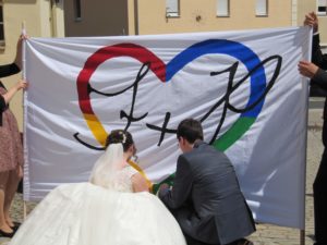An dieser Stelle möchte ich kurz ausholen, warum wir – Franziska und Pascal -Google als Thema für unsere Dekoration gewählt haben. Zu Beginn der Planung war uns klar, dass wir nicht unbedingt die klassischen Farben Weiß und Rosa für unsere Dekoration wollten und bei einer Weinschorne kam dann die Idee auf: „Warum nehmen wir nicht die Google-Farben für die Deko“.
