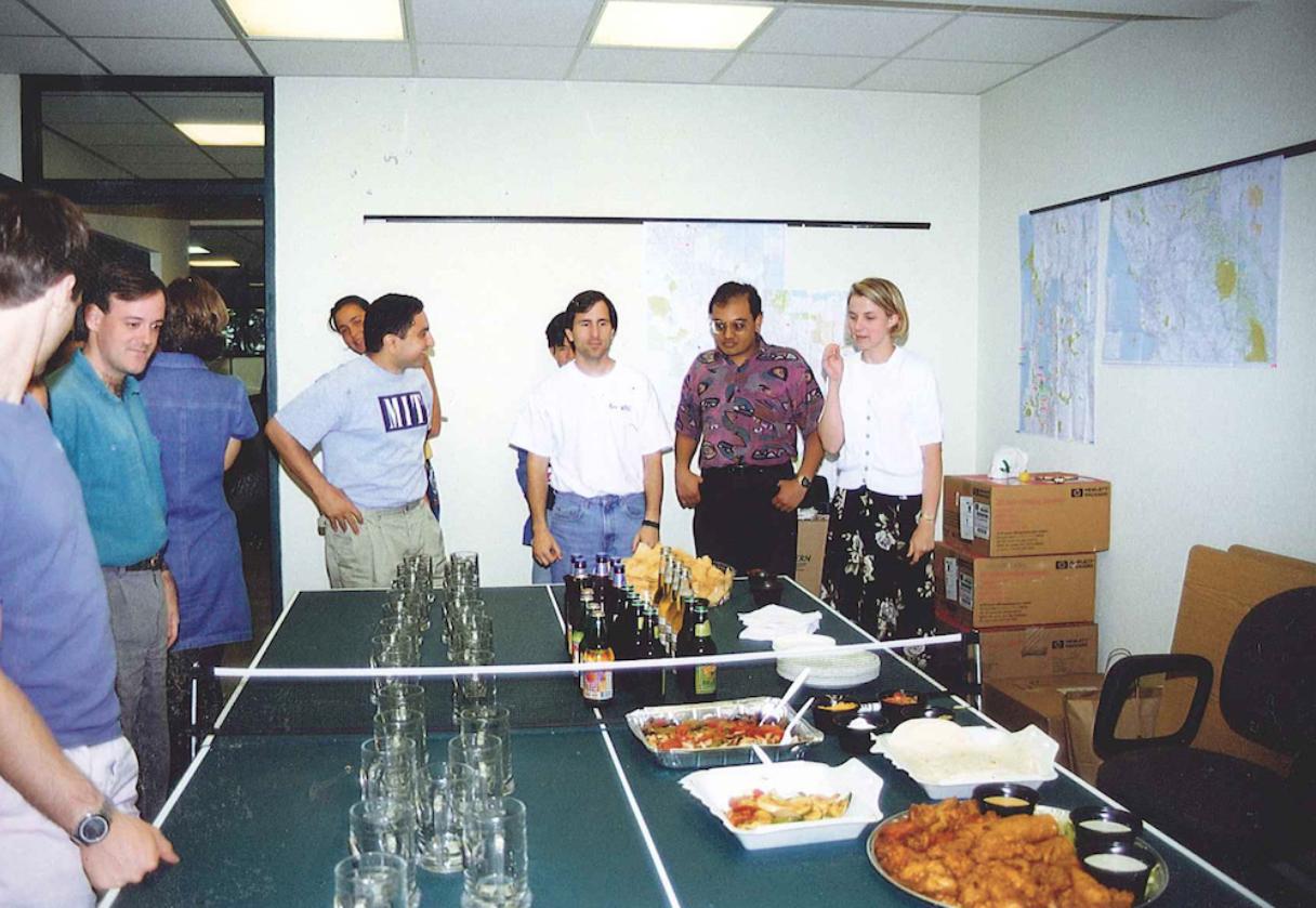 Ein früher TGIF bei Google. TGIF wurde entwickelt, um Kontakte zu knüpfen, Unternehmensfortschritte zu teilen und Fragen direkt an die Gründer von Google zu stellen. Sie werden immer noch regelmäßig in Google-Büros auf der ganzen Welt abgehalten.