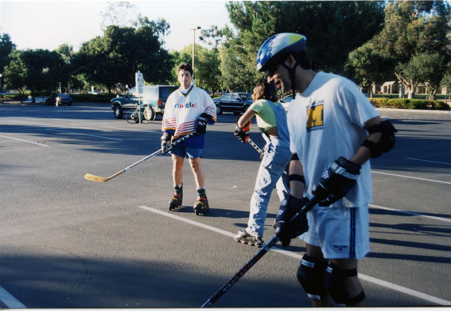 Auch Googler machen gerne eine Pause und haben Spaß. Larry und Sergey spielen Hockey auf dem Parkplatz mit anderen Googlern.