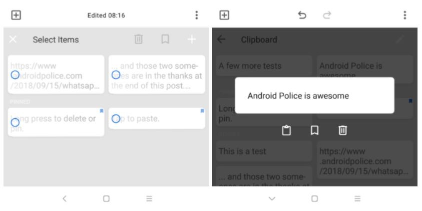 Mit einem Touch auf einen der Einträge lässt sich ein solcher auswählen und direkt in das aktive Textfeld einfügen. Wird die normale Funktion des Betriebssystems verwendet, wird wie gewohnt der jeweils letzte Eintrag eingefügt. Die Einträge lassen sich dort auch einzeln oder per Batch-Bearbeitung löschen oder bearbeiten. Das Bearbeiten der Zwischenablage ist ein Novum, für das man bisher auf alternative Apps angewiesen war.