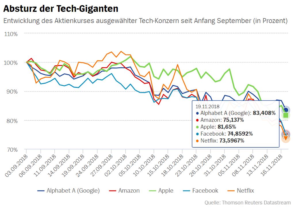 Facebook schlittert schon das ganze Jahr lang von einem Datenskandal in den nächsten und hat mit Nutzerschwund zu kämpfen. Netflix bekommt neue Rivalen durch Disney & Co. und selbst Amazon wird nicht ewig so stark wachsen können – was auch Jeff Bezos nun eingestanden und den Ruin von Amazon prognostiziert hat (allerdings eher als Warnung). Und bei Alphabet sind die Wolken auch nicht mehr ganz so rosarot wie in den vergangenen Jahren.