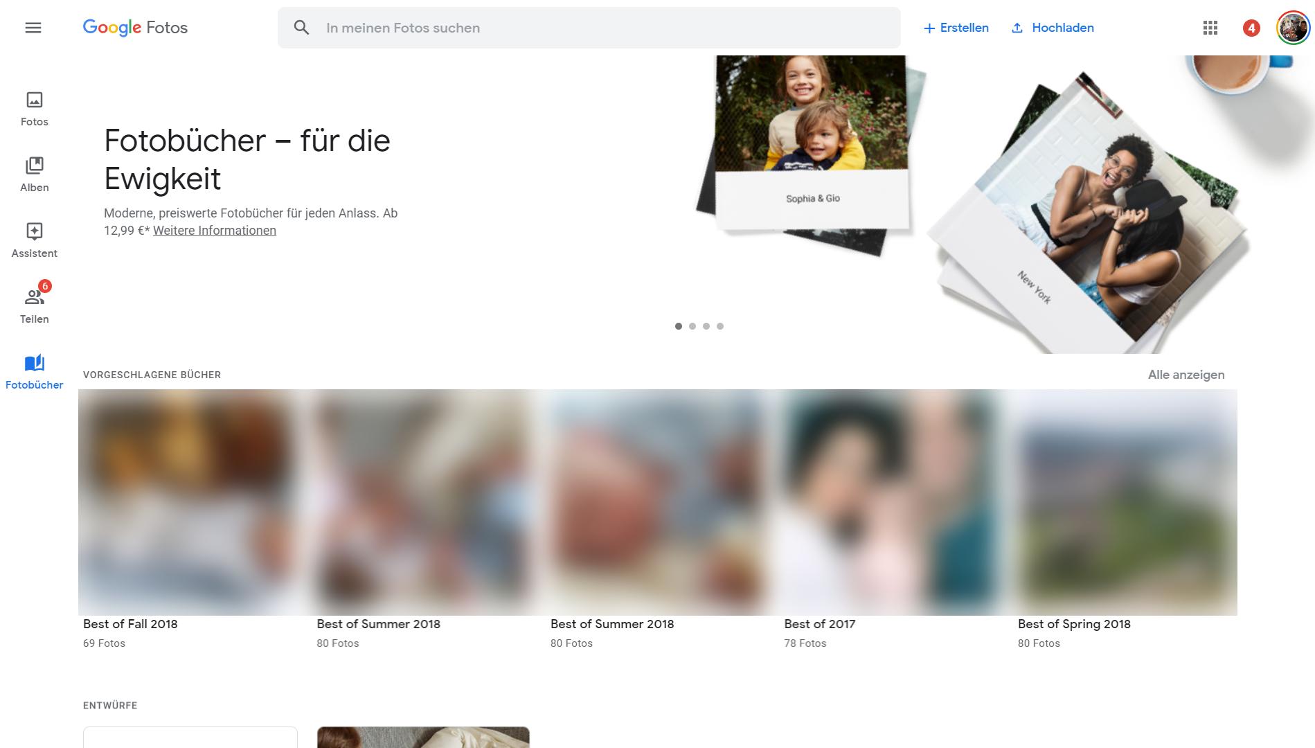 Ein solches Fotobuch lässt sich aktuell nur im Web erstellen, während der Menüpunkt auf dem Smartphone vollständig fehlt. Wird sicher ebenfalls eines Tages möglich sein, doch für den aktuellen Rückblick ist man noch auf den Browser angewiesen.