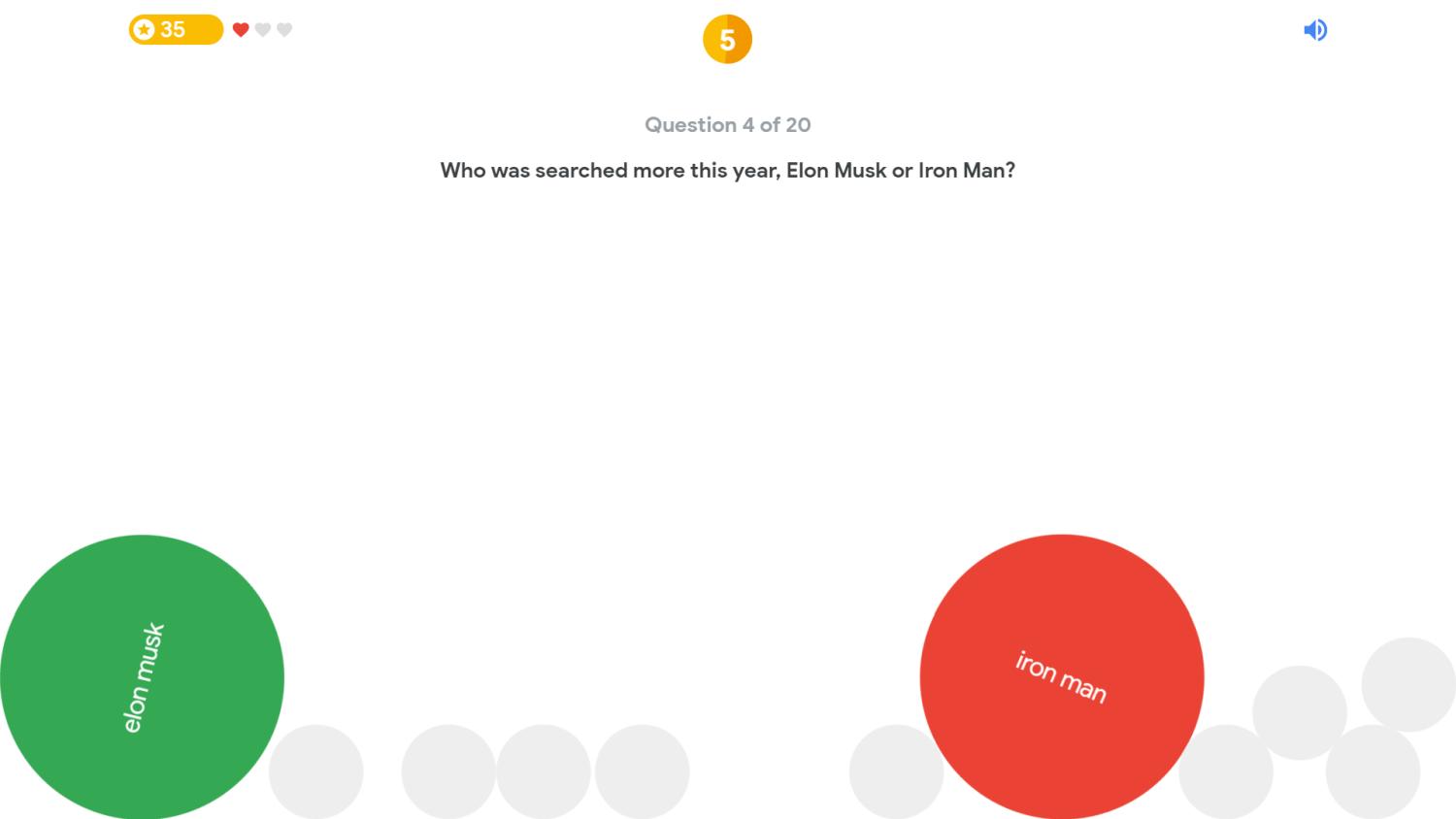 Google hat jetzt das Game of the Year veröffentlicht, das leider nur in englischer Sprache zur Verfügung steht, aber auch den deutschen Nutzern Spaß machen kann: Grundlegend fragt das Spiel den Nutzer um eine Einschätzung, welche der beiden Suchanfragen im Jahr 2018 beliebter gewesen ist. Zur Beantwortung jeder Frage stehen 10 Sekunden Zeitpolster zur Verfügung, für die korrekte Beantwortung sammelt man Punkte. Nach 3 falsch beantworteten Fragen ist das Spiel vorbei.