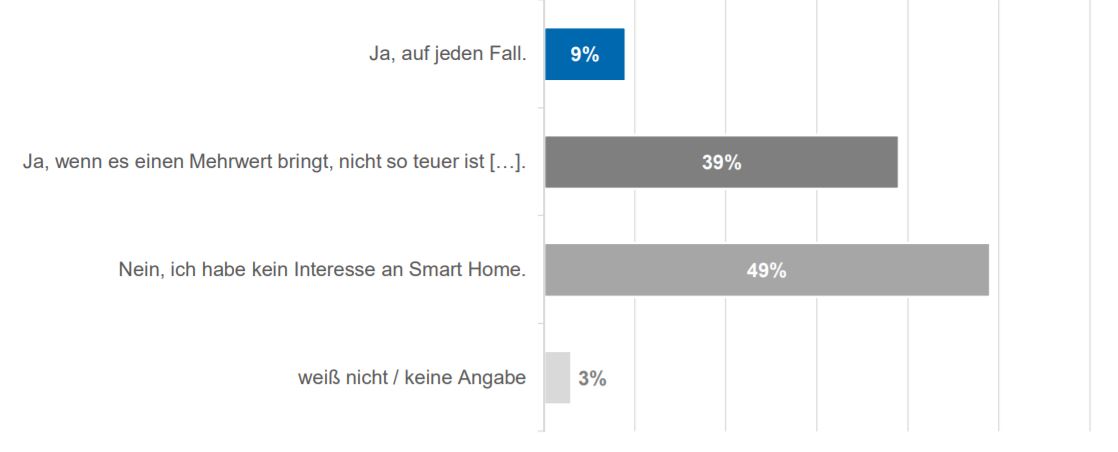 In der zweiten Runde wurden die Menschen befragt, ob sie denn Interesse an einem Smart Home haben – und da wurde es dann interessant. Gerade einmal 9 Prozent haben ein großes Interesse am Smart Home. Immerhin 39 Prozent hätten zwar Interesse, sehen aber wohl den Vorteil für sich noch nicht. Die Hälfte der Menschen hat sogar überhaupt kein Interesse am Smart Home und kann das Licht und die Kaffeemaschine auch ohne Assistent einschalten.