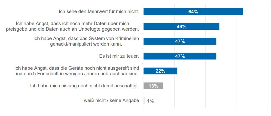 In der dritten Runde wurde nur die Hälfte befragt, die kein Interesse am Smart Home hat. Sie wurde nach den Gründen (auch Mehrfachauswahl) für das Desinteresse befragt. Gut zwei Drittel sehen tatsächlich keinen Mehrwert für sich – was gleichzeitig aber auch bedeutet, dass diese Gruppe mit Innovationen überzeugt werden könnte. Die Hälfte hat außerdem Angst davor, zu viele Daten preis zu geben oder ausspioniert zu werden. Der Hälfte ist ein Smart Home außerdem einfach zu teuer.