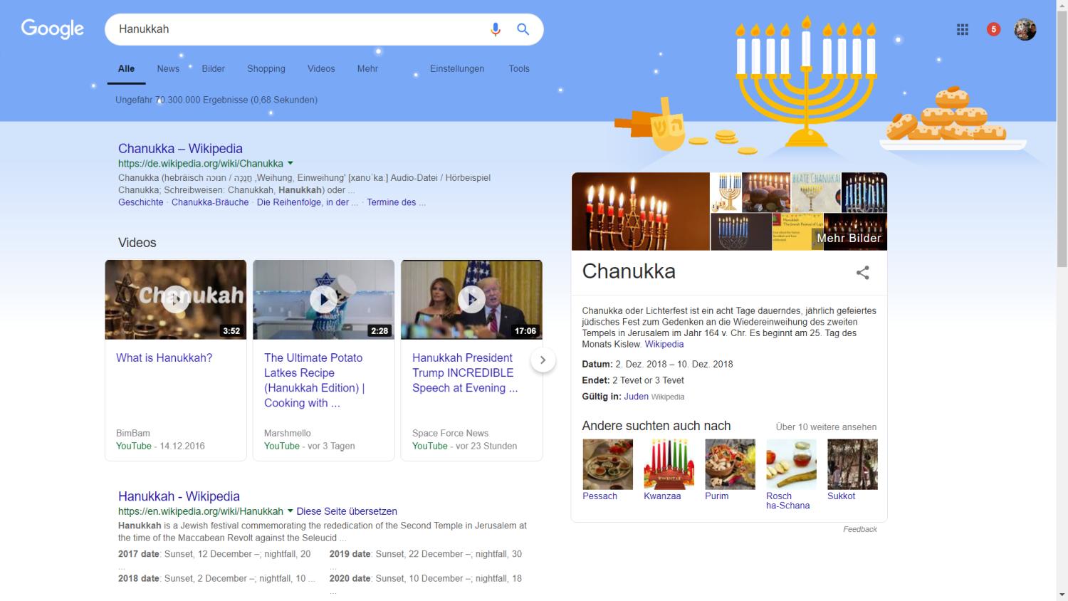 Auch das jüdische Hanukkah wird bedacht und bekommt in der Websuche eine eigene Dekoration. Da ich mich mit diesen Festen nicht auskenne, überlasse ich es euch selbst, was dort alles zu sehen ist.