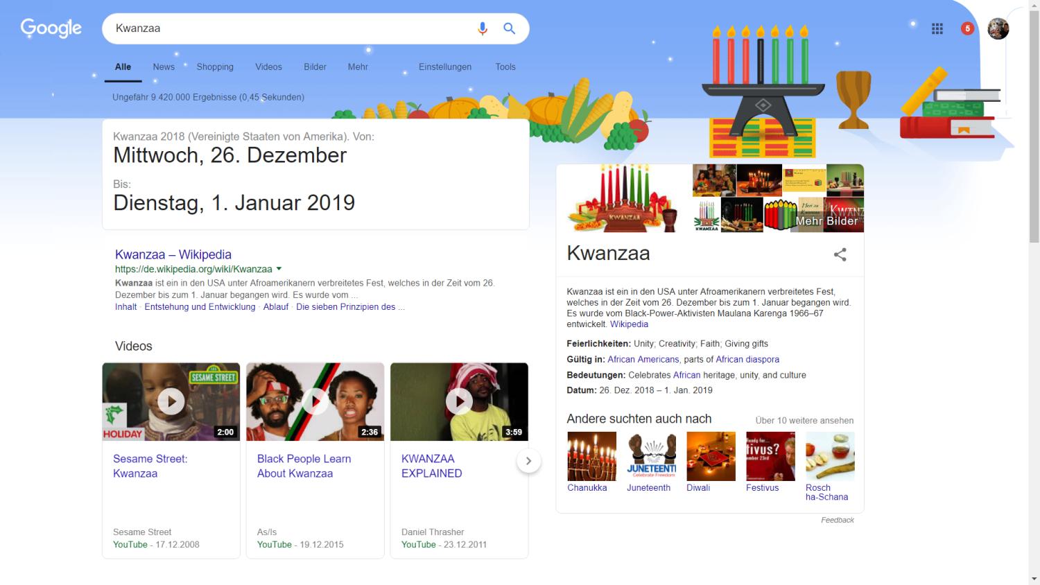Das US-afrikanische Kwanzaa-Fest wird ebenfalls in der Websuche bedacht und bekommt eine schöne Dekoration direkt über den Suchergebnissen.