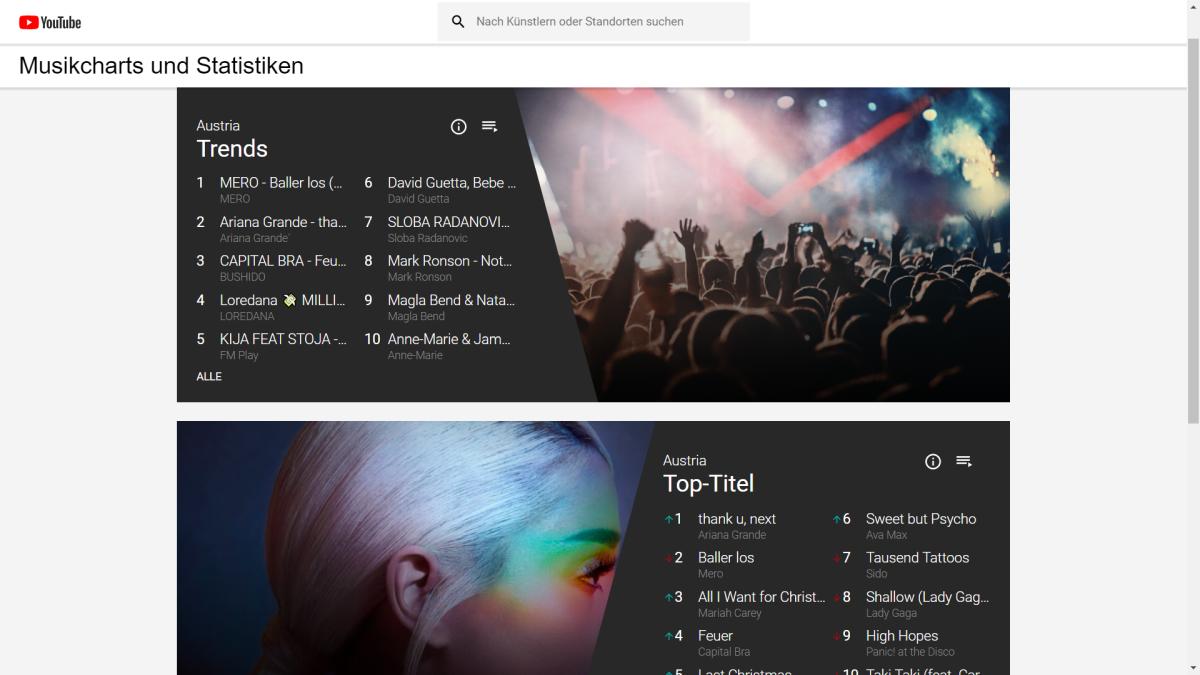 In den Top-Musikvideo-Charts werden offizielle Musikvideos präsentiert, die auf der Plattform am häufigsten angesehen werden.