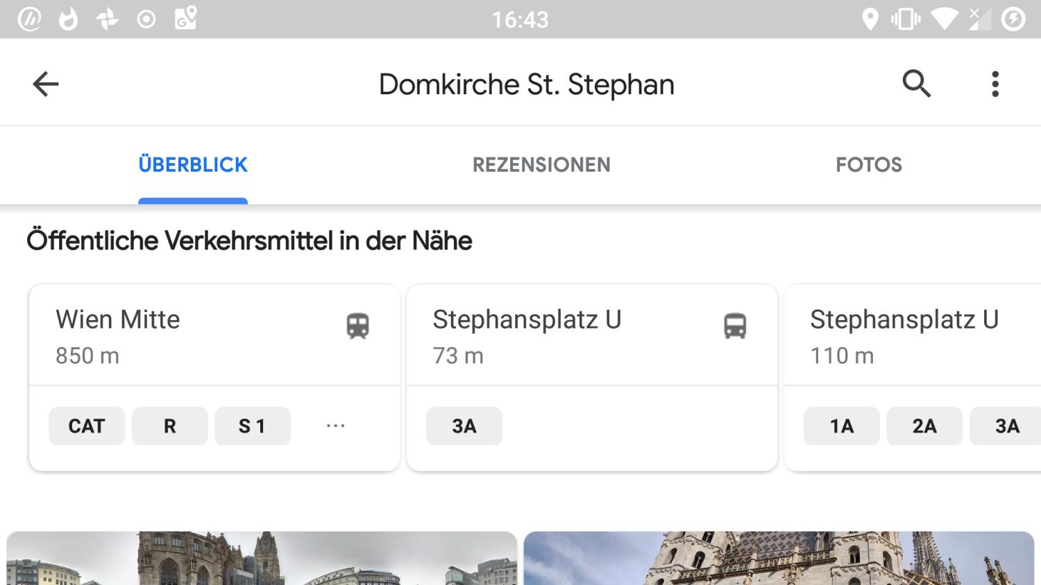 In den Detailinformationen gibt es bei vielen Nutzern nun den neuen Punkt „Öffentliche Verkehrsmittel in der Nähe“, der eine horizontal scrollbare Liste aller Verkehrsmittel zeigt, die in unmittelbarer Umgebung zu finden sind. Die Stationen sind nach Entfernung sortiert, wobei die größte Entfernung in meinen viele Tests etwa 2 Kilometer entspricht. Zu sehen ist der Name der Station, die dort verkehrenden Linien sowie die Entfernung. Live-Abfahrtszeiten gibt es nicht. Mit einem Touch auf das Icon gelangt man nicht zur Detailinfo der Station, sondern zur Navigation bis hin zum Standort.