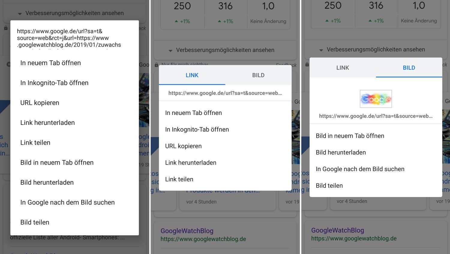 Das Kontextmenü von Chrome für Android kann je nach Objekt ganz unterschiedliche Ausmaße haben. Bei einem Link wird unter anderem die Möglichkeit zum Öffnen in einem neuen Tab, das Teilen oder Herunterladen angeboten. Bei einem Bild wird das Speichern, Teilen oder Öffnen in einem neuen Tab angeboten. Tippt man dann aber auf ein Bild mit einem Link, dann kann es unübersichtlich werden. Und genau daran arbeiten die Chrome-Designer derzeit – seit August 2017.