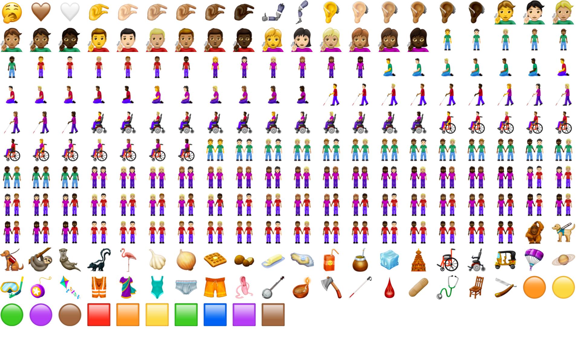 Neu dabei ist ein müdes Emoji, eine neue Handbewegung, viele Emojis für körperlich behinderte Menschen wie etwa Hörgeräte, Rollstuhl oder auch ein Kunstarm und Kunstbein sowie ein Gehstock und ein Blindenhund. Außerdem gibt es neue Kleidungsstücke, Lebensmittel aber auch einen Eiswürfel oder einen Bluttropfen. Die Auswahl ist also wieder mal bunt gemischt, legt aber eindeutig den Schwerpunkt auf Menschen mit Behinderungen.