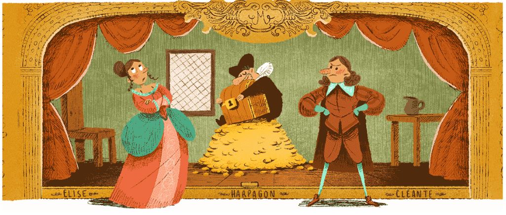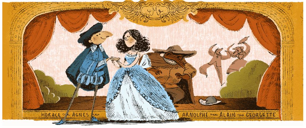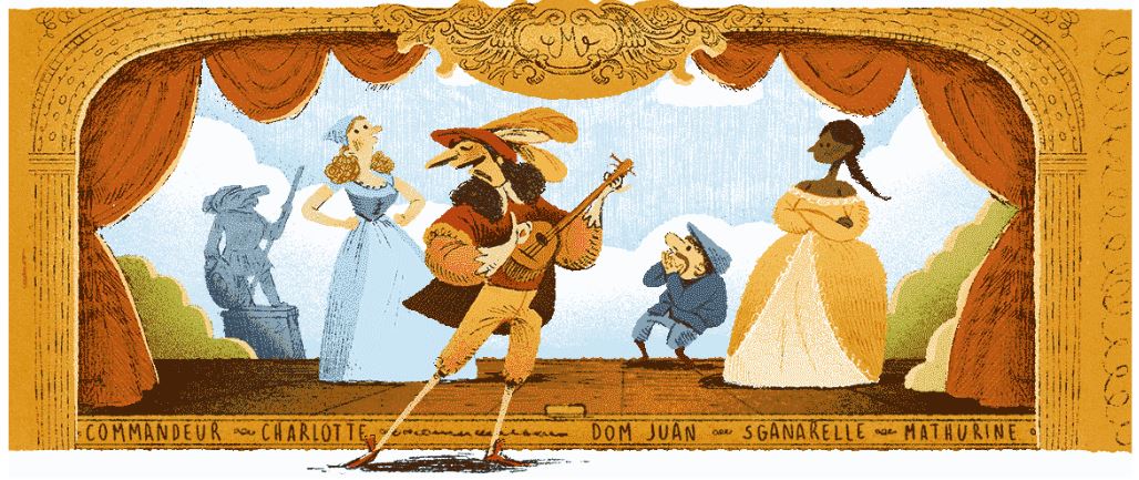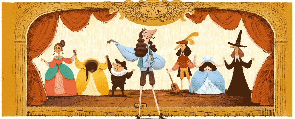 Das heutige Doodle zeigt Molière während der Ausübung seiner drei großen Leidenschaften: Er steht auf der Bühne seines Theaters, führt ein Stück auf und hält dabei auch eine Feder in der Hand, mit der er schon wieder am nächsten Werk arbeitet. Im Hintergrund befinden sich die Buchstaben des Google-Logos als Requisite, die von der Decke hängen. Der in der Mitte platzierte Play-Button zeigt uns an, dass sich hinter dem heutigen Doodle noch mehr verbirgt. Nämlich einige seiner populärsten Stücke.
