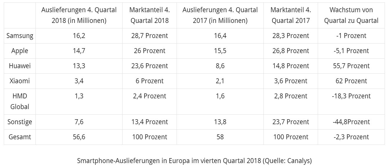 Der Smartphone-Markt ist in Europa im 4. Quartal um 2,3 Prozent geschrumpft. Statt 58 Millionen Smartphones konnten die Hersteller in den vergangenen drei Quartalsmonaten nur 56,6 Millionen Geräte ausliefern. Das ist zwar kein ganz so dramatischer Einbruch wie weltweit, der global bei Minus 6,3 Prozent liegt, aber dennoch ist auch in unseren Breiten das große Wachstum erst einmal vorbei. Die Top 3 sieht in Europa gleich aus, wie weltweit.