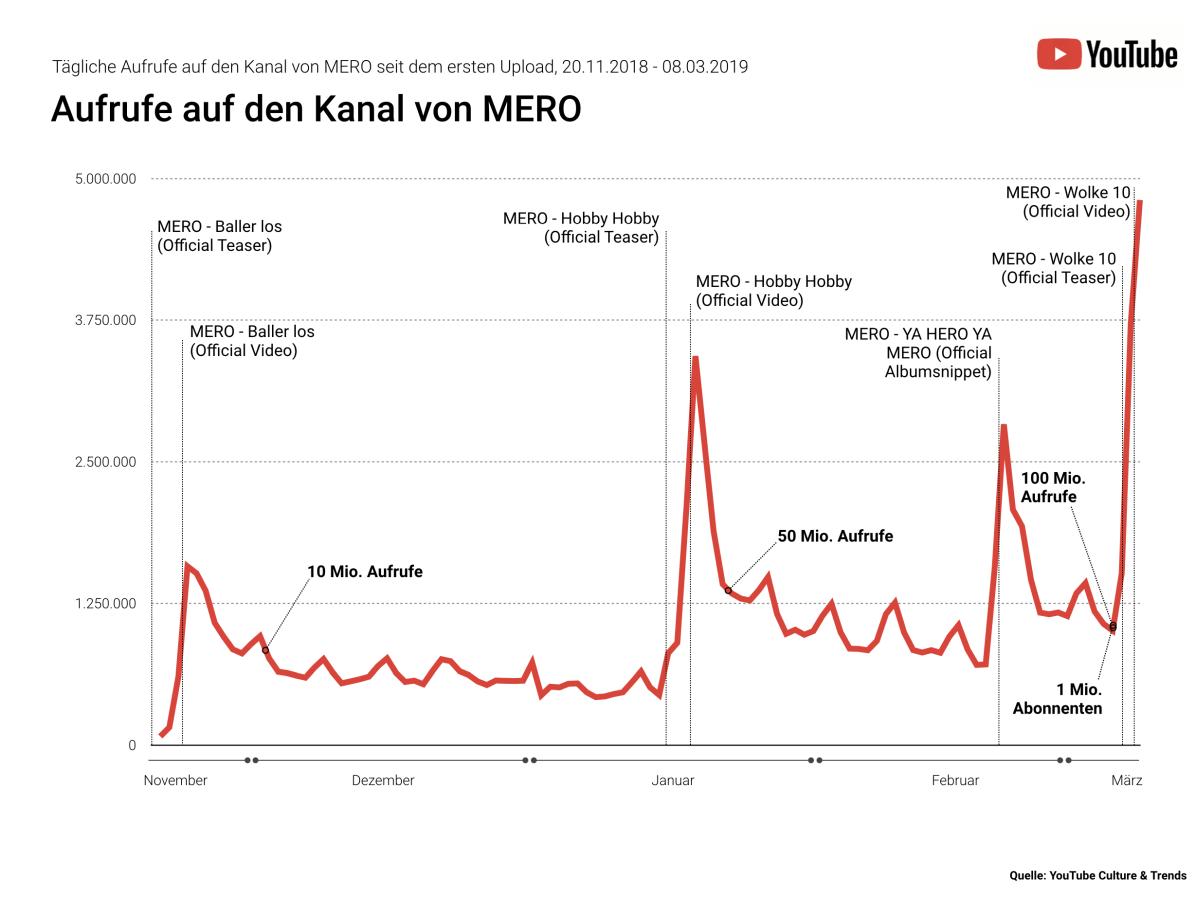 Der große Erfolg des Rappers zeigte sich bereits in den letzten Wochen: Bereits 109 Tage nachdem der Künstler auf seinem YouTube-Kanal das erste Video veröffentlichte, konnte er eine Millionen Abonnenten verzeichnen. Kurz zuvor hatte MERO bereits den Meilenstein von mehr als 100 Millionen Views auf seinem Kanal erreicht. Anfang des Jahres hat YouTube Music den Künstler in die Liste der „Artists to Watch“ für 2019 aufgenommen.