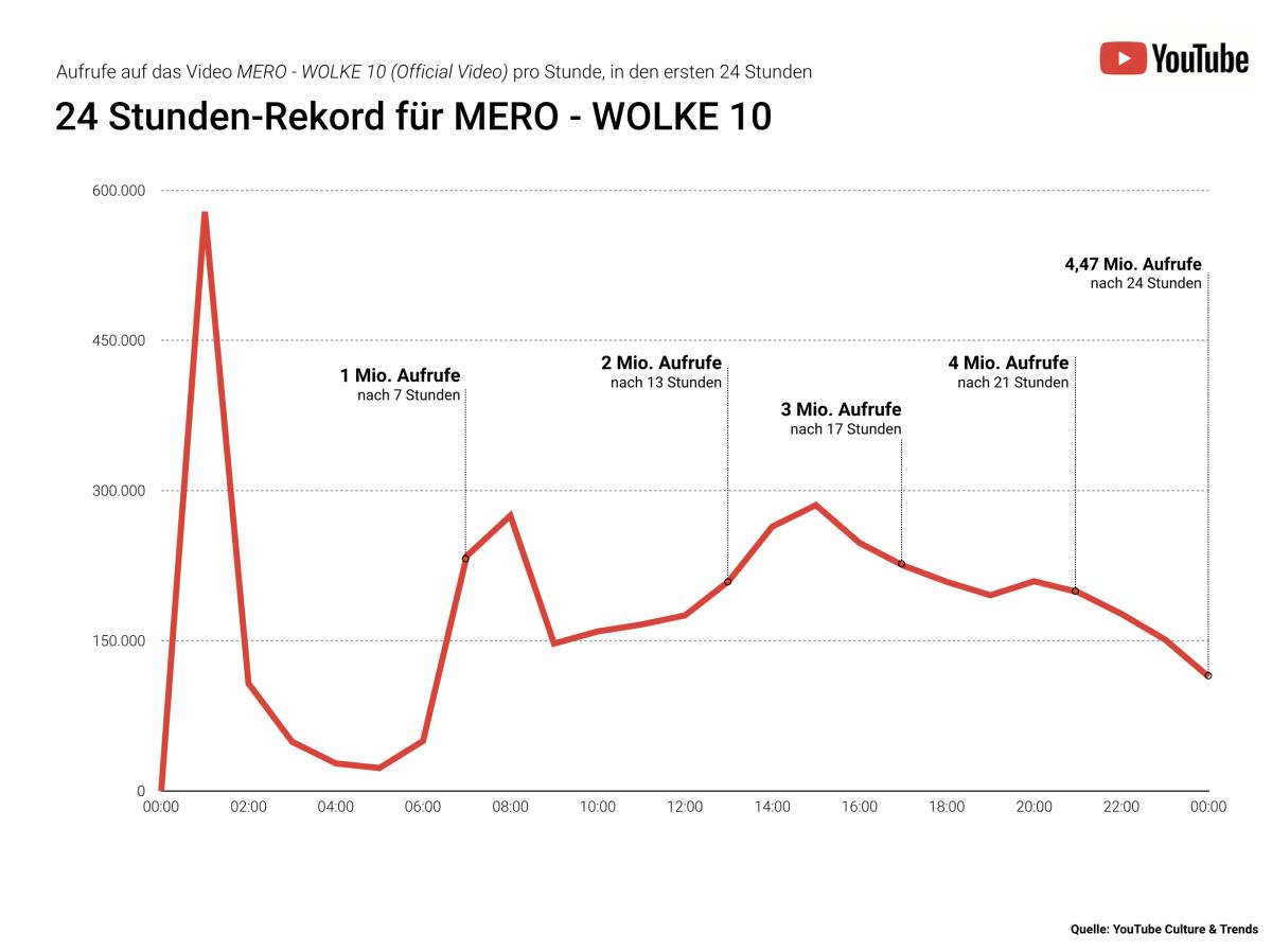 Am Donnerstag, dem 7. März, hat der Rapper MERO sein neues Musikvideo WOLKE 10 veröffentlicht und ist damit direkt auf Rekordjagd gegangen. Innerhalb von nur 24 Stunden konnte die Marke von 4,47 Views durchbrochen werden – Rekord für einen deutschen Hip-Hopper. Wie auf folgendem Screenshot zu sehen ist, gingen die Aufrufe innerhalb der ersten zwei Stunden durch die Decke, vermutlich wegen automatischer Benachrichtigungen, um dann kurz darauf abzufallen und erst mit steigender Verbreitung wieder anzuziehen.